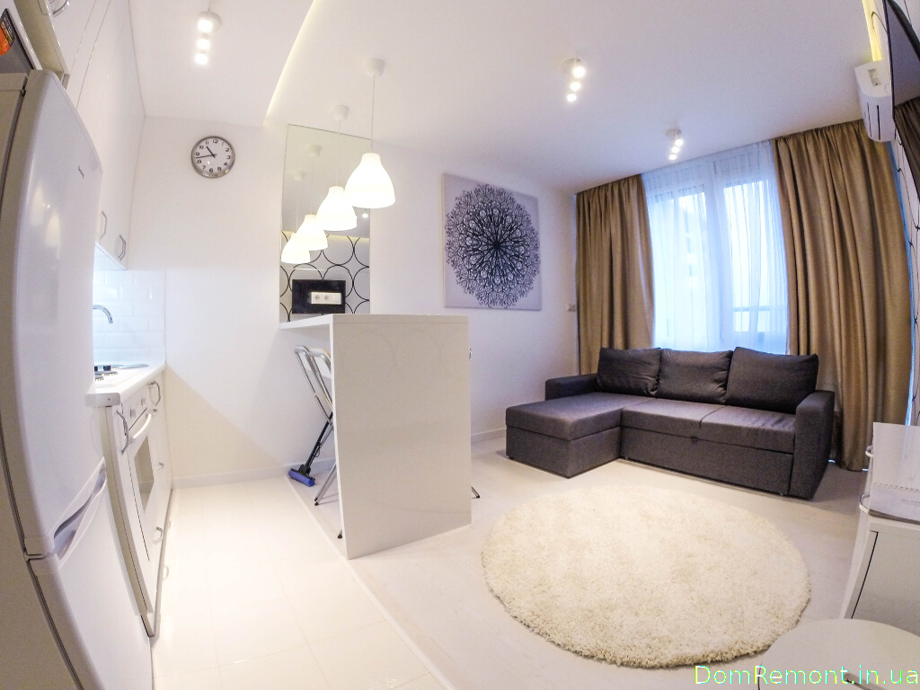 Використання карнизних подсветок зробило цю квартиру дуже світлою, що в поєднанні з білим кольором в інтер'єрі візуально збільшує простір.