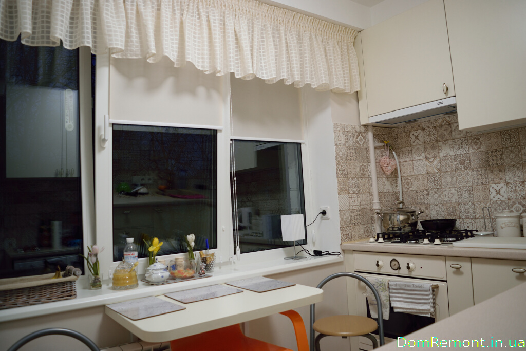 Оскільки кухня в квартирах даної планування має зовсім невелику площу, було прийнято рішення замінити класичний кухонний стіл на більш компактний варіант, що нагадує барну стійку. Це додало інтер'єру легкості і створило ілюзію більшого простору. Стіни кухні викладені плиткою.