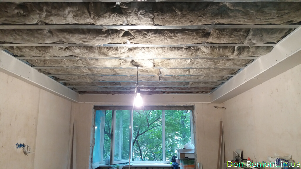Для того, щоб галасливі вечірки у сусідів зверху не заважали відпочивати, була виконана повна звукоізоляція стелі мінеральною ватою.