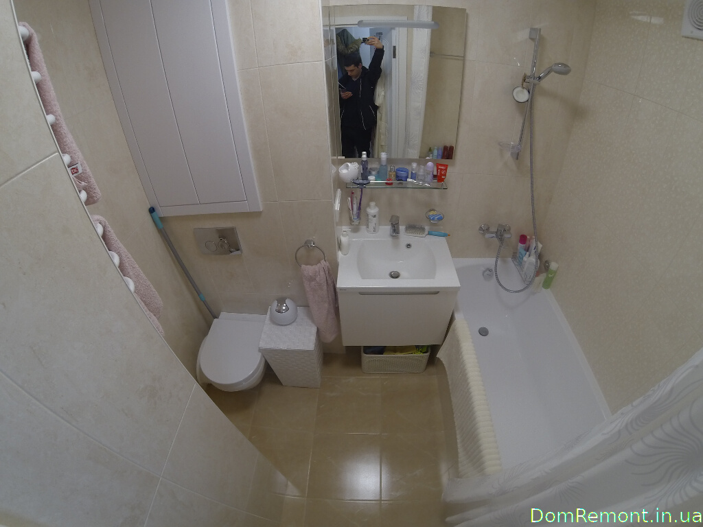 Санвузол зазнав повної перепланування - була трохи збільшена його площа і змістили в бік для більш зручного розміщення меблів і комплектуючих. Всі необхідні комплектуюіе були розташовані максимально компактно, бойлер і система фільтрів розмістилися в шафці.